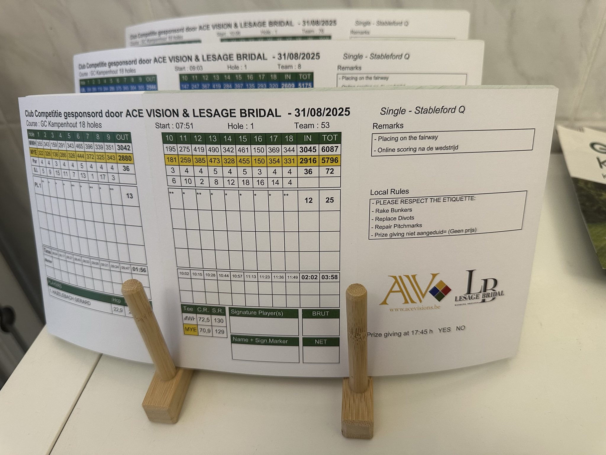 Ace Visions and the wedding store Lesage Bridal in Mechelen sponsor an 18-hole golf competition and the 9-hole “rabbit” competition at the Golfclub Kompenhout. Guanita Lesage, the owner of Lesage Bridal, won her first competition but was so kind that she handed her prize to the second-best “rabbit” in the women’s category. The participants enjoyed beautiful weather and a great atmosphere and achieved very nice scores. Ace Visions has also distributed the cache cameras to all the participants to help protect their privacy but, together with Lesage Bridal, pleased the winners with the prizes, including golf equipment and accessories. Special thanks to the Golfclub Kampenhout’s secretariat and The Loft’s waiting staff for their contribution to this beautiful day.